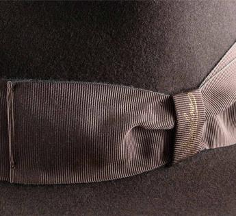 Die berühmte Prestigemarke wählte für diese Kreation den Fedora aus hochwertigem Filz. Das Modell ist dank eines Designs von hoher Qualität, elegant und schick, bequem. Der ikonische Hut ist hier mit einem einfachen Satin-Grosgrain verziert, das den Namen seines Schöpfers in goldener Schrift trägt. Er kann allein unseren Look veredeln.