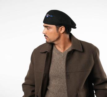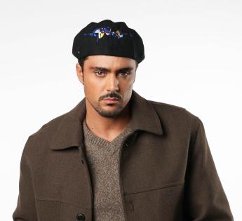 Flat cap neu interpretiert mit einem künstlerischen und zeitgenössischen Touch. Auf der Rückseite schafft eine abstrakte Stickerei in lebendigen Farben, die in unserem Atelier entworfen und gefertigt wurde, einen auffälligen Kontrast von Formen und Materialien.
