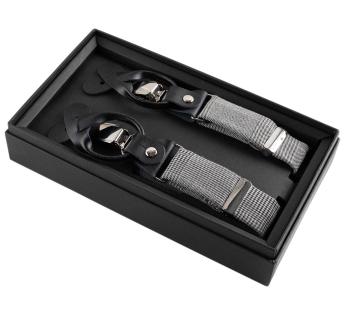 Die Enden sind erstklassig: gemischte Befestigungen (Metallclips und Lederriemen), robuste Nähte und Präsentation in einer eleganten Box. Das grafische Design des Stoffes verleiht eine Note diskreter Raffinesse, ideal auf einem schlichten Hemd. Ein Accessoire mit starker Persönlichkeit, das für Langlebigkeit gedacht ist und sowohl in eine Bürogarderobe als auch für einen besonderen Anlass passt.