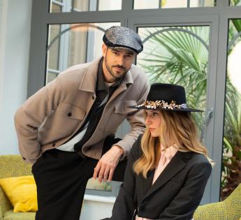 Eine echte Kappe eines Künstlers, gefertigt aus einem Jacquardgewebe mit glänzenden Mustern, die Weichheit und Eleganz schaffen. Sie hat großzügige Formen, mit einer breiten und langen Krempe sowie einem Schnitt, der sowohl flach als auch sehr weit ist. Sie kann auf viele Arten getragen werden, schräg zur einen Seite oder sogar verkehrt herum. Die Krempe ist aus reiner Wolle, was einen Materialkontrast mit retro Einflüssen schafft. Sie ist warm und angenehm zu tragen.