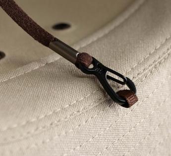 Hinter seiner Abenteurer-Ästhetik verbirgt dieser Baumwollhut eine beeindruckende Funktionalität. Das dichte Gewebe bietet optimalen Sonnenschutz, die belüfteten Ösen regulieren die Wärme und der abnehmbare Kinnriemen sorgt für sicheren Halt bei Wind.