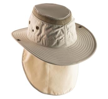 Wasserabweisender Travellerhüte, perfekt für den Außenbereich mit seinem robusten und atmungsaktiven Design. Der obere Teil der Kopfhöhe enthält ein Netzband zusätzlich zu den Belüftungsösen, was seine Atmungsaktivität verstärkt. Ein abnehmbarer Nackenschutz optimiert den vollständigen Schutz vor Sonnenstrahlen.
