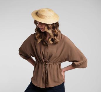 Revisited Boater Kreissäge aus genähtem Stroh. Er sitzt nicht vollständig auf dem Kopf, sondern bleibt dank eines elastischen Bandes, das hinter dem Nacken unter dem Haar geschoben wird, an Ort und Stelle. Wir lieben es, ihn schräg zu tragen, sodass der Krempenbreite des Hutes den Blick betont.