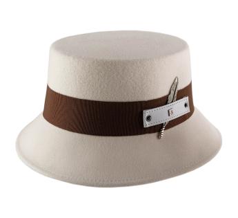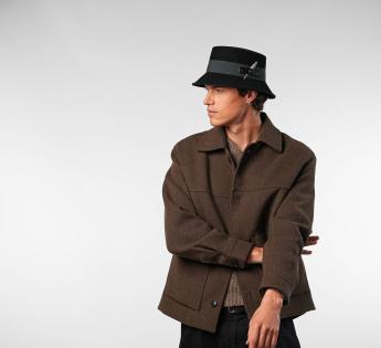 Kühn und strukturiert, verführt dieser Wollfilz-Fischerhüte mit seiner zeitgenössischen Ausstrahlung. Er ist mit einem breiten Grosgrain-Galon verziert, der mit einer metallischen Verzierung in Form einer Feder geschmückt ist, die auf einer gesteppten Lederlasche befestigt ist.