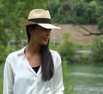 Modell eines Fedora aus einem natürlichen Material, das mit einem schwarzen Galon aus Grobgewebe und einer flachen Schleife verziert ist. Eine Verarbeitung, die die authentische Seite dieses sehr leichten Huts auf dem Kopf verstärkt.