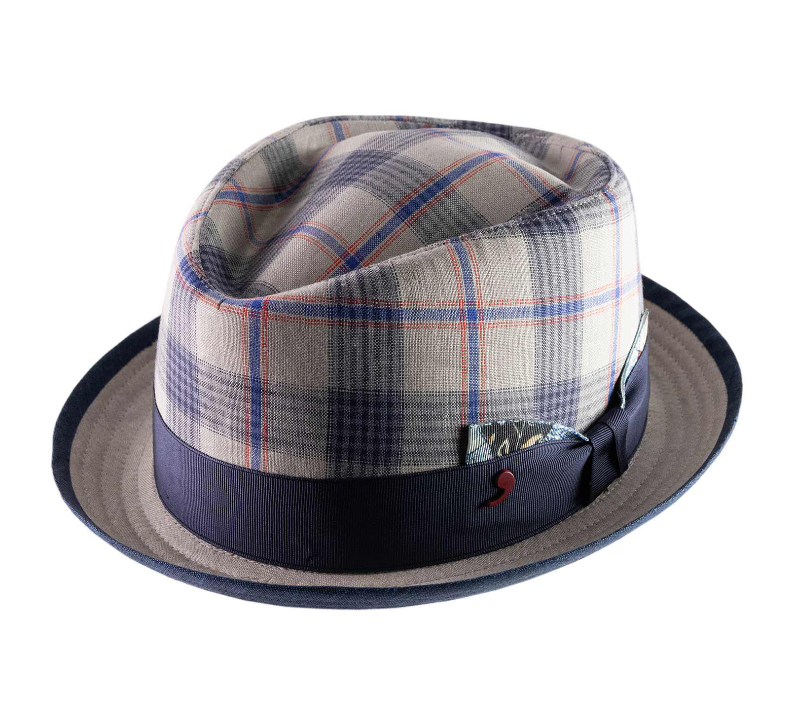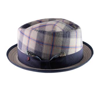 PorkPie Hüte in seinem schicken und eleganten Aussehen. Der Hauch von Eleganz wird durch das satinierte Galon mit einer Fliege aus gemustertem Stoff verstärkt. Die Futter zeigt sich mit karierten Mustern für einen urbanen und zeitgenössischen Stil.