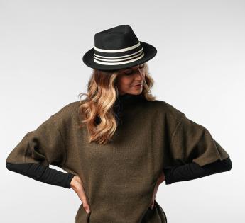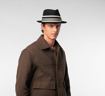 Perfekte Balance zwischen Schlichtheit und Kühnheit, dieser Fedora-Hut mit mittellanger Krempe besticht durch seine dezente Form, die sich leicht im Alltag tragen lässt. Aus leichtem, aber warmem Filz gefertigt, wird er durch einen ultra-grafischen Galon aufgewertet, der strukturiertes Strick, glatten Satin und kontrastierende Endet kombiniert.