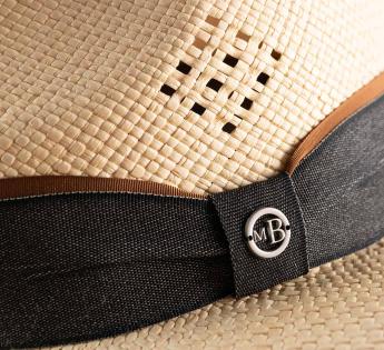 Dieser hut besticht durch seine schlichte, gepflegte Linie und offenbart seine Einzigartigkeit in einem durchbrochenen Muster, das wie feine Spitze in die Fasern der Panamahüte gezeichnet ist. Ein kostbares Detail, fast wie ein Schmuckstück, das das Licht einfängt und den Look vollendet.