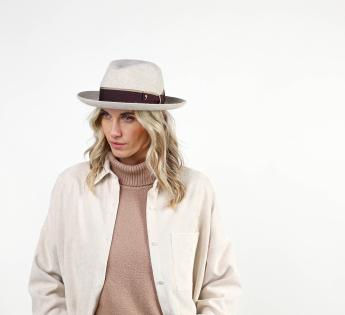Fedora neu interpretiert mit einem mittellangen Rand, geformt aus flexiblem Filz, der leicht zu accessoirisieren ist. Mit einer Drahtbürste wurden die Haare des Kopfbedeckung gezogen, um diese Illusion von Fell zu erzeugen. Das Modell wird durch eine moderne und dynamische Schicht von Bändern ergänzt, die eine gespaltene Kopfhöhe umschließt.