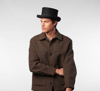 Eine Ikone der zeitlosen Eleganz, dieser Zylinder aus gehärtetem Filz verkörpert absoluten Raffinement. Mit seiner geraden Kopfhöhe, dem satinierten Innenfinish und dem klassischen Grosgrain-Galon, verleiht er eine edle und selbstbewusste Silhouette. Perfekt für große Anlässe, verleiht er jedem formellen Outfit eine theatralische und distinguierte Note.