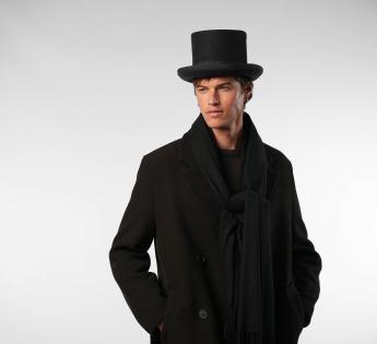 Dieser Zylinder aus gehärtetem Wollfilz verkörpert Eleganz in ihrer reinsten Form. Seine bewusst betonte hohe Kopfhöhe schafft eine majestätische vertikale Linie, die Unterschrift großer Zeremoniensilhouetten. Der steife Filz, präzise gearbeitet, sorgt für einen tadellosen Halt und eine raffinierte Verarbeitung.