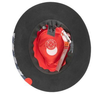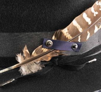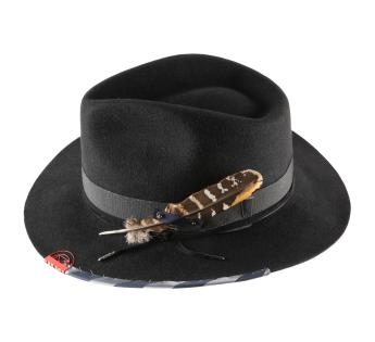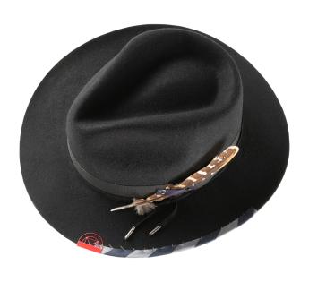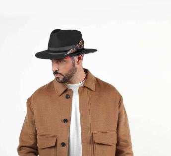 Travellerhüte, die eine Mischung aus Materialien mit Filz, Metall und grob gewebtem Satin präsentiert, ergänzt durch eine Feder. Seine Kopfhöhe von Standardhöhe vereint sich mit seinem eher breiten Krempenbreite, um gut vor Kälte zu schützen und Schatten für die Augen zu spenden. Er bietet uns Wärme und Komfort dank seines dichten Materials.