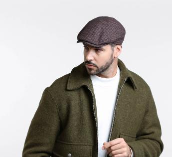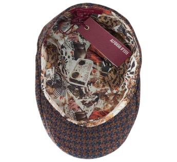 Flachkappe im retro-vintage Stil. Sie ist mit einem zweifarbigen Hahnentritt-Muster verziert. Das Ganze bietet einen traditionellen und zeitlosen Look.