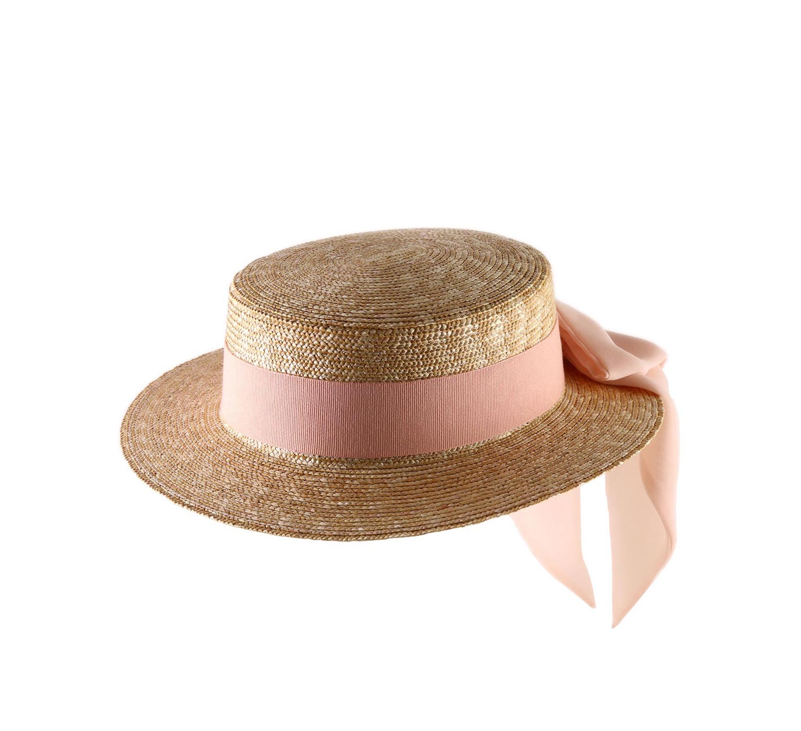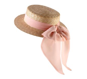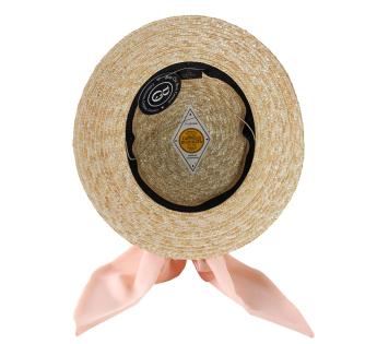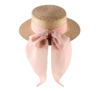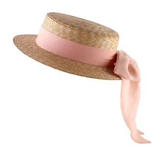 Boater Kreissäge aus fein genähtem Stroh, hergestellt in Italien. Er ist mit einer handgefertigten Musselin-Schleife aus unserer Werkstatt in Frankreich verziert. Es handelt sich um ein Modell für kleine Mädchen, ganz in Eleganz.