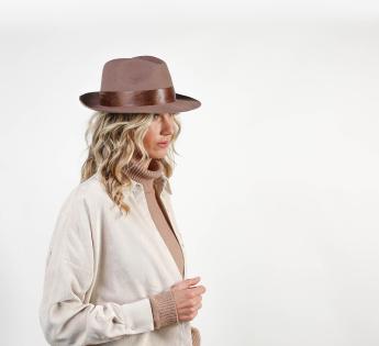 Filzhut, die durch einen Galon aus distressed Leder bereichert wird, der einem einfachen Knoten eine verspielte Note verleiht. So entsteht ein Kontrast mit einem Ring und Satin. Die Materialschichtung ist gelungen und macht das Modell origineller. Es handelt sich um einen Fedora, der von Natur aus elegant und per Definition stilvoll ist.