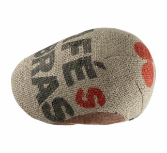 Diese duckbill Cap erzählt eine Geschichte, besitzt Struktur und eine echte Präsenz. Ihre Kopfhöhe aus recyceltem Jutegewebe, gewonnen aus Kaffeesäcken, verleiht ihr einen rauen, einzigartigen und weltoffenen Stil, der durch Leineneinsätze sanft abgerundet wird.