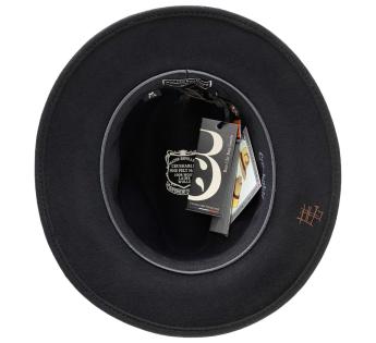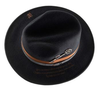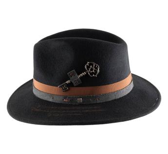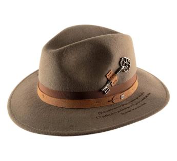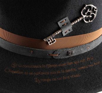 Vollständig aus dichtem und strukturiertem Wollfilz geformt, interpretiert dieses Modell die klassische Form der Travellerhüte durch eine symbolische Ästhetik, inspiriert vom poetischen Universum von Lewis Carroll, neu. Ein alter Schlüssel, anstelle der traditionellen Feder befestigt, wird zum Emblem des Geheimnisses der Zeit, ein direkter Hinweis auf den verrückten Hutmacher aus Alice.