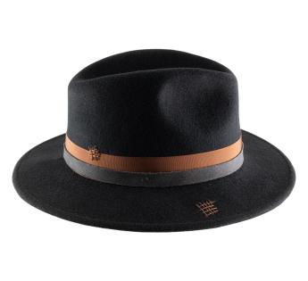 Das Ensemble wird durch einen doppelten, kontrastierenden Galon aus rohem Wildleder und Satinband hervorgehoben. Dieses Spiel der Texturen, zwischen Rauheit und Weichheit, betont die einzigartige Ausstrahlung dieses Hutes mit starkem Charakter.