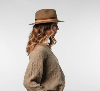 Das Ensemble wird durch einen doppelten, kontrastierenden Galon aus rohem Wildleder und Satinband hervorgehoben. Dieses Spiel der Texturen, zwischen Rauheit und Weichheit, betont die einzigartige Ausstrahlung dieses Hutes mit starkem Charakter.