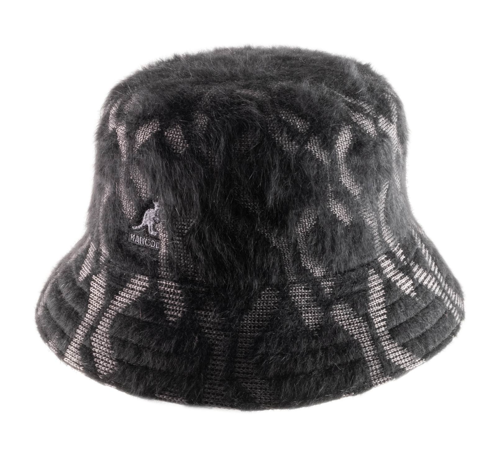 Fischerhüte mit vagen geometrischen Mustern. Sie bietet das Aussehen eines schönen Pelzeffekts, das durch Angora erzeugt wird. Das Känguru-Logo des berühmten Designers ist auf der Rückseite gestickt, während es vorne für einen urbanen Look getragen werden kann.