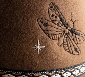 Hut in Fedora-Form, personalisiert mit Stickereien im Tattoo-Stil. Sie umhüllen die Kopfhöhe, die ebenfalls mit einem feinen Galon mit passenden geometrischen Mustern verziert ist.