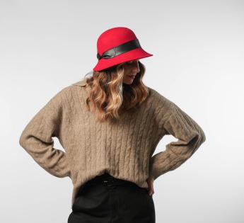Schick und feminin, dieser Glockenhüte aus Filzwolle besticht durch seine Retro-Linie und seine umhüllende Silhouette. Er wird durch eine flexible Lederverzierung akzentuiert, die elegant gekniffen wird, um dem Ensemble Charakter zu verleihen.