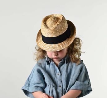 Hut für Kinder, für Mädchen oder Jungen, entworfen für den Sommer. Sie ist aus natürlichem Stroh genäht in Italien. Anschließend ist sie mit einem Galon in Schwarz dekoriert.