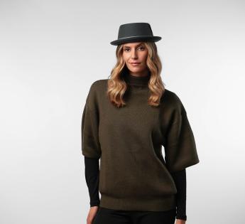 PorkPie Hüte aus australischer Schafwolle, sowohl elegant als auch funktional. Seine flache Kopfhöhe und die Krempe erhoben zeichnen eine klare, urbane Silhouette, ideal, um ein Outfit subtil zu strukturieren. Entworfen aus natürlich wasserabweisender und flexibler Wolle, widersteht er den Herausforderungen des Alltags und bietet gleichzeitig Komfort und Halt.