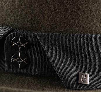 Selbstbewusster Stil und sorgfältige Details: Dieser neu interpretierte Porkpie spielt mit dem subtilen Kontrast zwischen preppy Geist und zeitloser Eleganz. Sein Grosgrain-Galon, gearbeitet wie ein Hemdkragen und verziert mit zwei bestickten Knöpfen, zieht sofort die Blicke auf sich. Ein dezentes Label und eine feine Stickerei auf der Krempe, ein Augenzwinkern zum Faden der Knöpfe, verstärken diese raffinierte Harmonie.