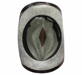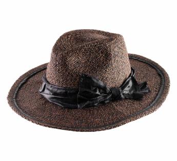 Strohhut im Steampunk-Stil. Ihr markantes Design ist mit einem Galon aus Krokodilleder verziert. Das Stroh ist durch schwarze Färbung gealtert.