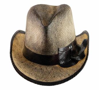 Strohhut im Steampunk-Stil. Ihr markantes Design ist mit einem Galon aus Krokodilleder verziert. Das Stroh ist durch schwarze Färbung gealtert.