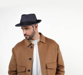 Chapeau trilby mit einem 100 % Seiden-Grosgrain verziert und mit einem Hauch von Satin-Grosgrain, das zur Farbe des Filzes passt, akzentuiert. Das Modell ist somit in einer Mischung aus Texturen mit edlen Materialien und passend zur Saison gefertigt.