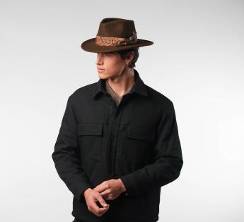 Eine perfekte Verbindung von Eleganz und Charakter, dieser Travellerhüte wird mit großer handwerklicher Sorgfalt in unserer Werkstatt in Lyon gefertigt. Er zeichnet sich durch einen Galon aus, der auf den Farbton des Filzes abgestimmt ist und mit zarten Arabeskenmustern verziert ist. An einigen Stellen leicht glänzend, mit einem subtilen Samteffekt, fängt er das Licht ein und bereichert die Silhouette des Hutes.